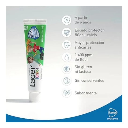 Lacer Junior Dental Gel Mint Flavour 75ml é uma pasta de dentes ideal para crianças. Graças ao seu agradável sabor a menta, facilita os hábitos de higiene oral.