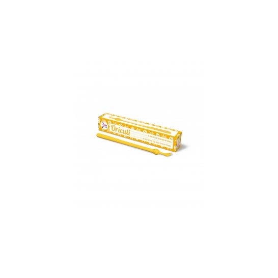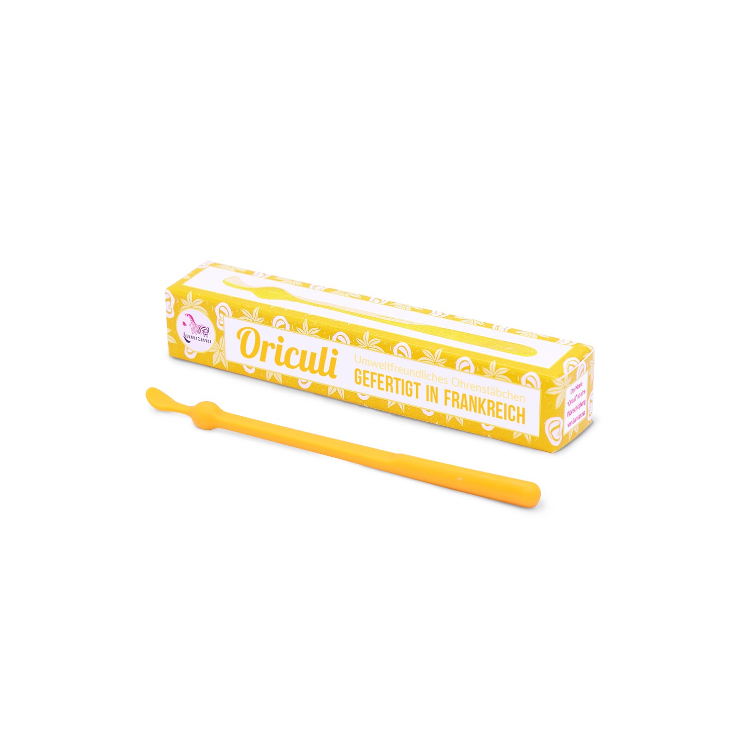 Cotonete reutilizável amarelo para os ouvidos Oriculi da Lamazuna. Feito de bioplástico 100% ecológico e muito resistente. Ajuda a prevenir a formação de tampões de cera. É mais econômico e sustentável. Usa-o para remover a cera visível. Zero desperdício. Cruelty-free. Vegan.