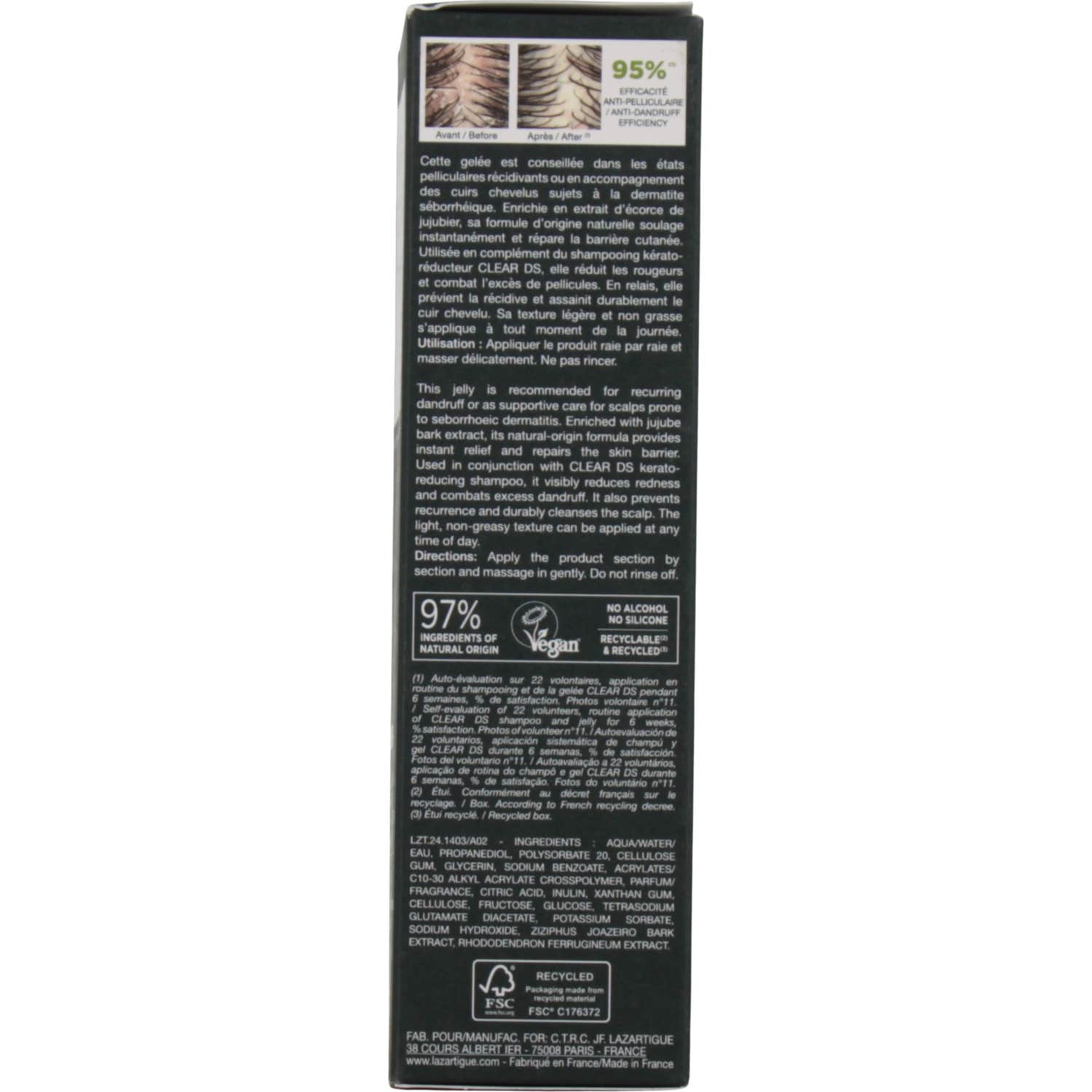 Lazartigue Clear DS é aplicado sem necessidade de enxágue, o que facilita seu uso tanto em couro cabeludo seco quanto úmido. Não deixa resíduos oleosos e permite que o cabelo mantenha sua flexibilidade e seja fácil de pentear. Este produto é livre de álcool e silicone, e é adequado para veganos.