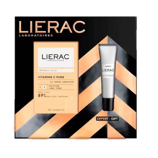 Lierac Cofre Protocolo Brilho Sérum Vitamina C + Diopti Olheiras é um conjunto exclusivo projetado para realçar a beleza da pele e destacar a tua essência pessoal. Este pack inclui dois produtos destacados: