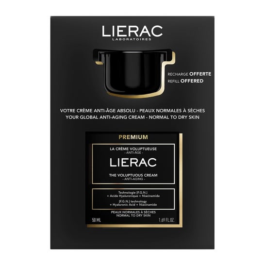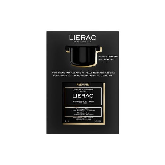 Lierac Pack Premium Creme Voluptuosa 50ml + Refil foi concebido para nutrir a pele e corrigir todos os sinais de envelhecimento: rugas, linhas de expressão, manchas, falta de firmeza, elasticidade, densidade e luminosidade, desidratação.