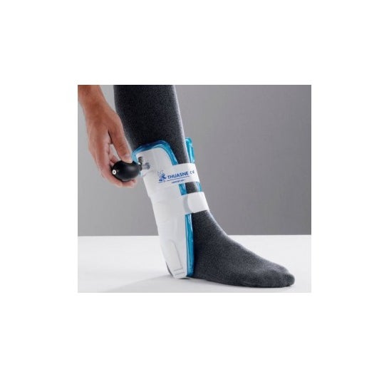 - 2 conchas rígidas para uma excelente imobilização do tornozelo - Ar para uma boa distribuição da pressão - Correias auto-aderentes para um ajuste preciso da cinta - Fixadores pivotantes para dorsiflexão e flexão plantar.flexão e flexão plantar - Cinta calcânea regulável em largura para um melhor ajuste ao tornozelo - Almofadas interiores insufláveis personalizadas para uma boa adaptação à morfologia - Válvula de fácil acesso para uma insuflação fácil das almofadas com o tornozelo apoiado - Bomba que poupa espaço - Posicionamento fácil do tornozelo graças a um marcador impresso - Manutenção fácil: limpar o tornozelo com um pano húmido INDICAÇÃO