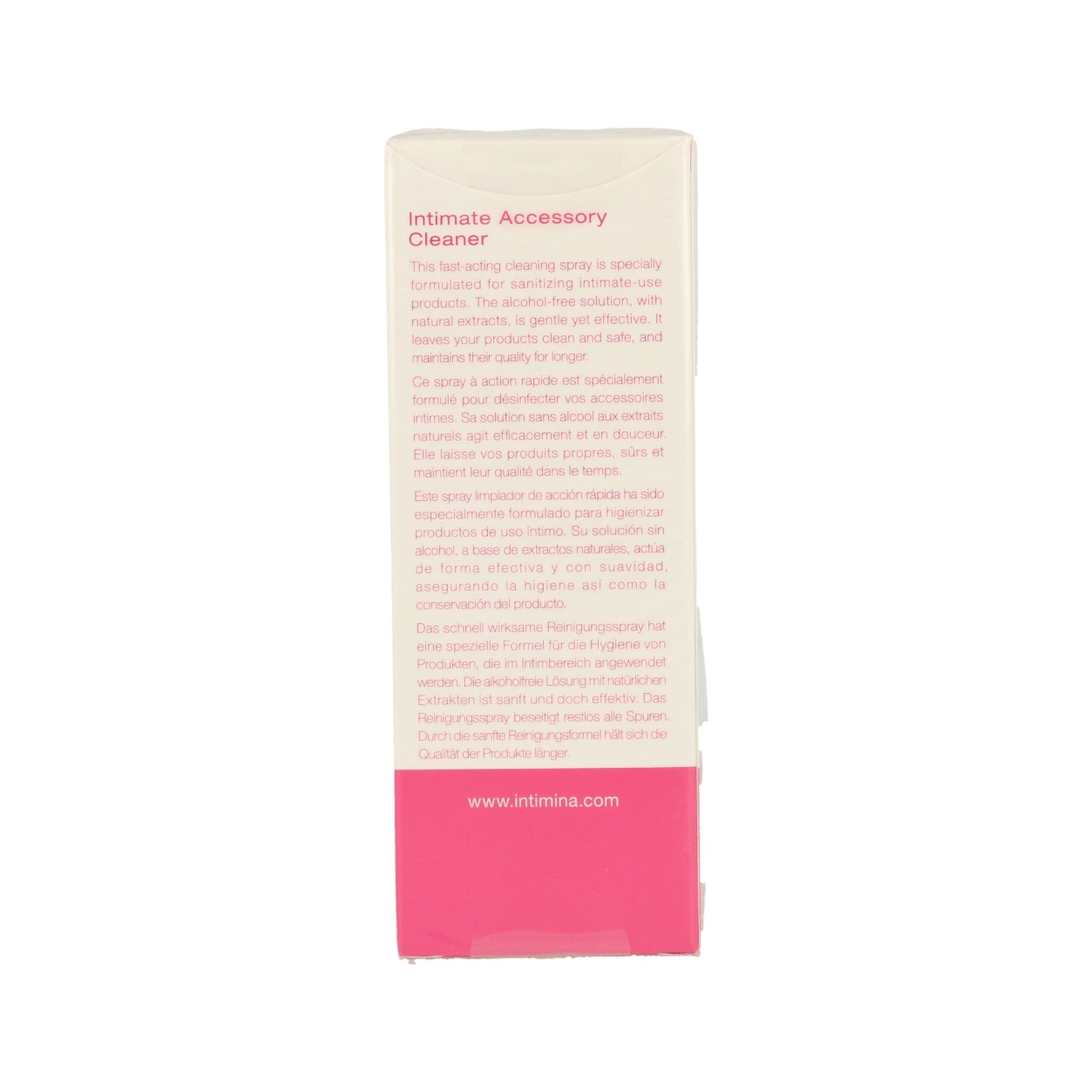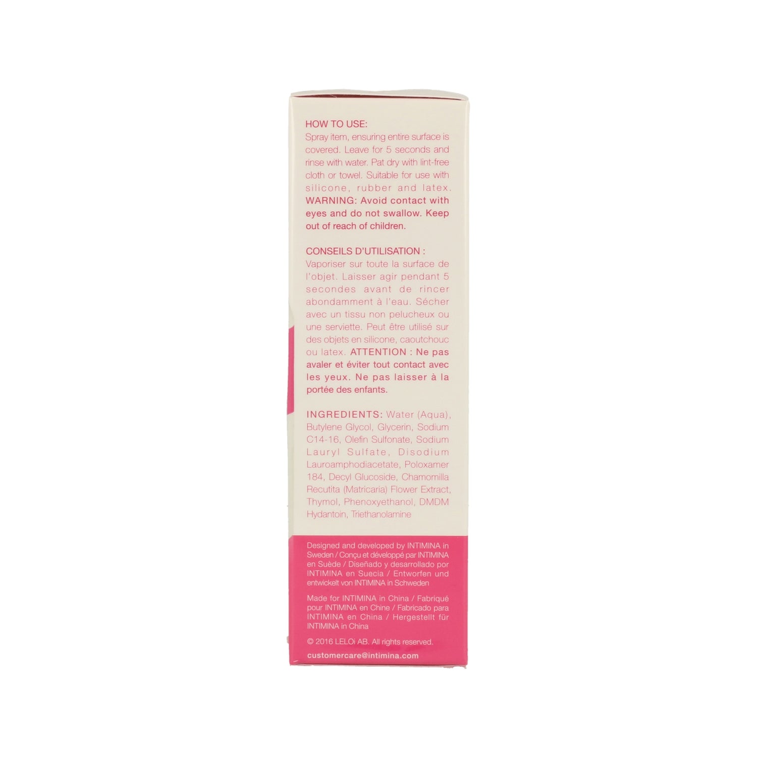 O Limpador de Acessórios Íntimos Intimina 75ml é um prático e fácil de usar spray desenhado para limpar brinquedos sexuais e outros produtos íntimos. A sua composição de acção rápida sem álcool higieniza a superfície do produto em segundos, enquanto os sais de zinco suavizam a solução para evitar qualquer possibilidade de irritação.