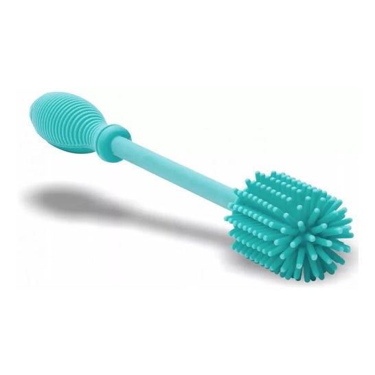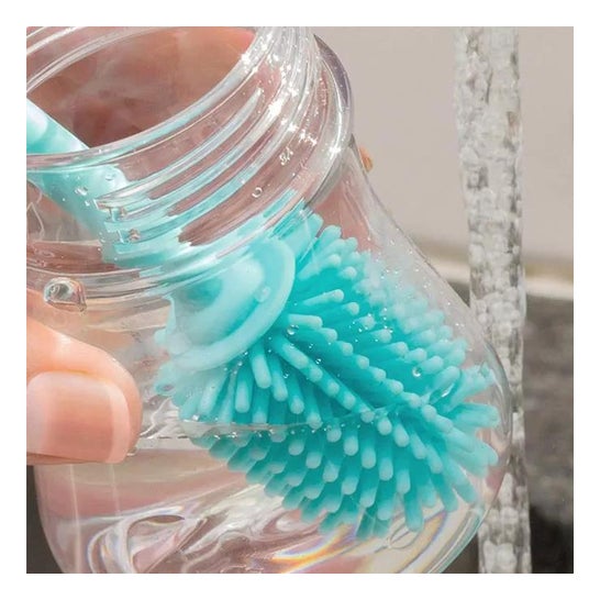 Escova de limpeza para biberões, tetinas e chupetas com cerdas de silicone.