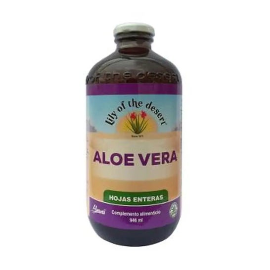 OLírio do Deserto de Aloé Vera Whole Leaf Glass 946ml é um suplemento alimentar feito de folhas inteiras de aloé vera e contém polissacáridos e ácidos orgânicos, tais como o ácido málico.