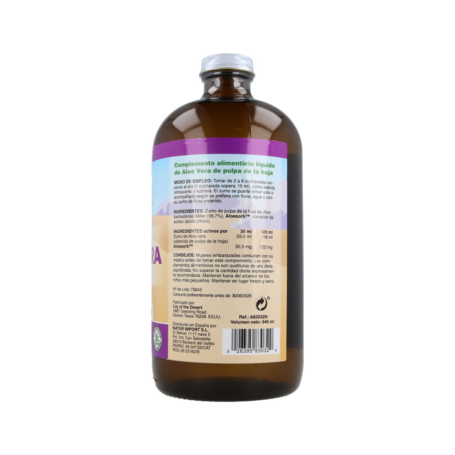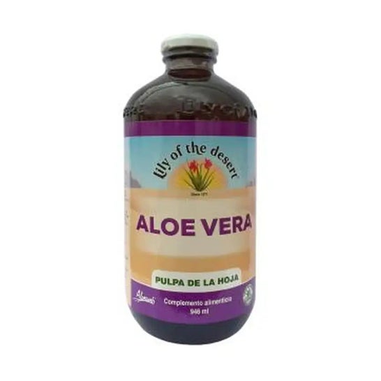 Lírio do Deserto de Aloé Vera Pulp Leaf Glass 946ml é um suplemento alimentar feito de polpa de aloé vera e contém polissacáridos e ácidos orgânicos, tais como ácido málico.