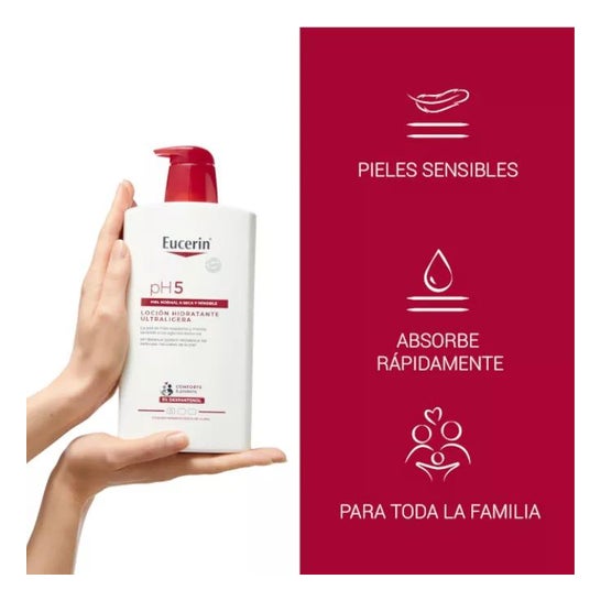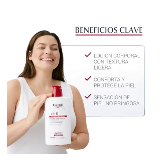 Eucerin Loção Hidratante Ultralight pH5 1000ml é uma loção corporal suave que ajuda a acalmar a irritação e a reduzir a desidratação na pele sensível e seca.