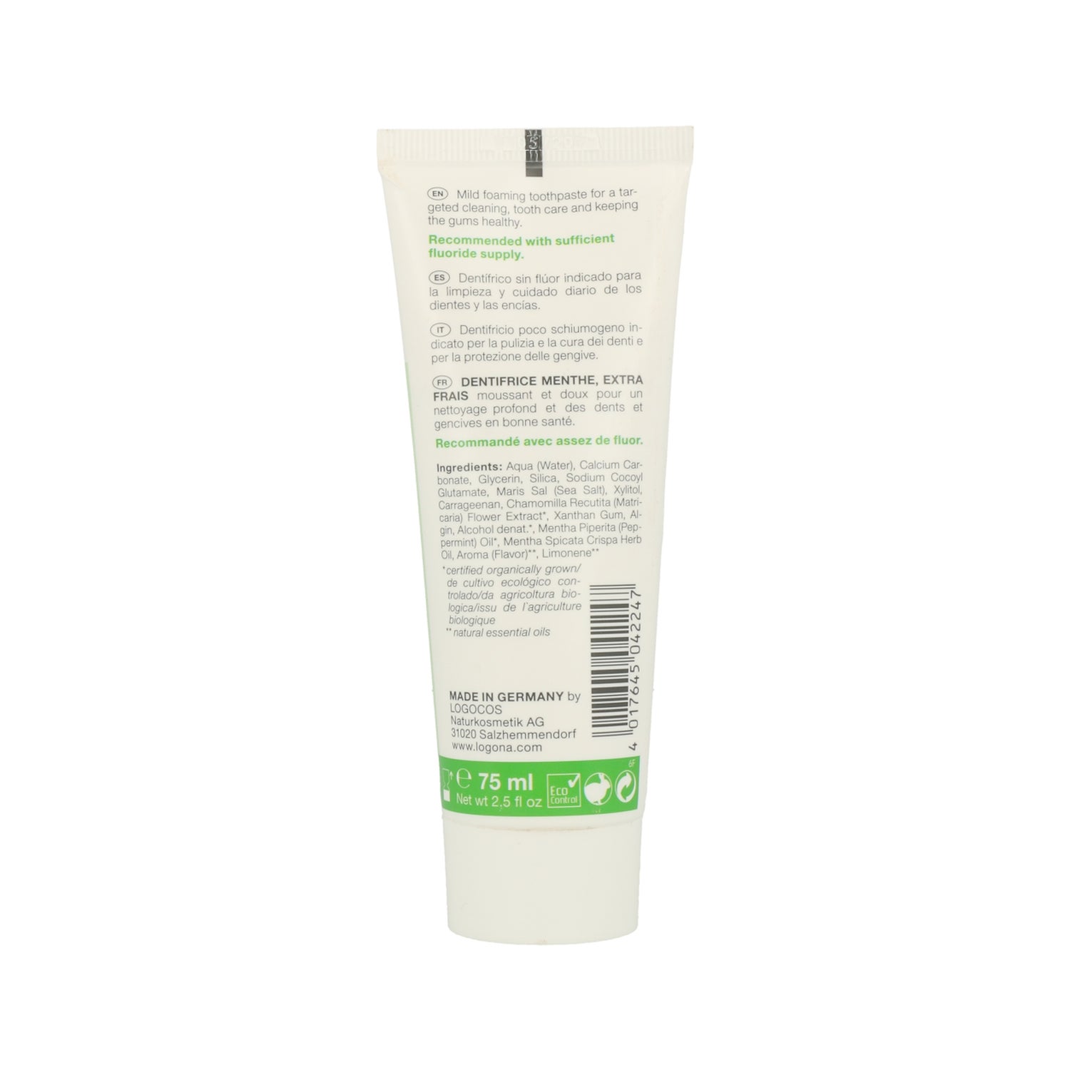 Pasta de dentes com aroma de mentol e extrato de camomila. Ajuda a manter o hálito fresco e limpa suavemente os dentes e as gengivas sem danificar o esmalte. A sua fórmula é isenta de flúor sintético, conservantes e aromatizantes.
