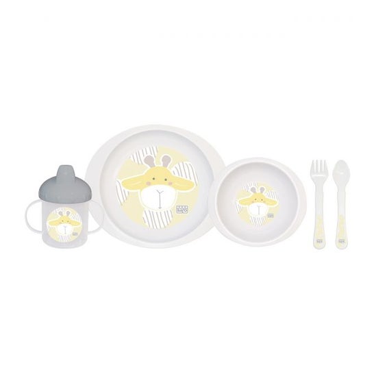Conjunto de 5 peças: Prato, tigela, caneca com 2 pegas, colher e garfo. Graças aos seus desenhos divertidos, a hora da refeição torna-se mais fácil e divertida. Leves e resistentes. Ideal para o teu bebé aprender a comer sozinho. Idade recomendada: mais de 6 meses. O conjunto é adequado para microondas e máquina de lavar louça.