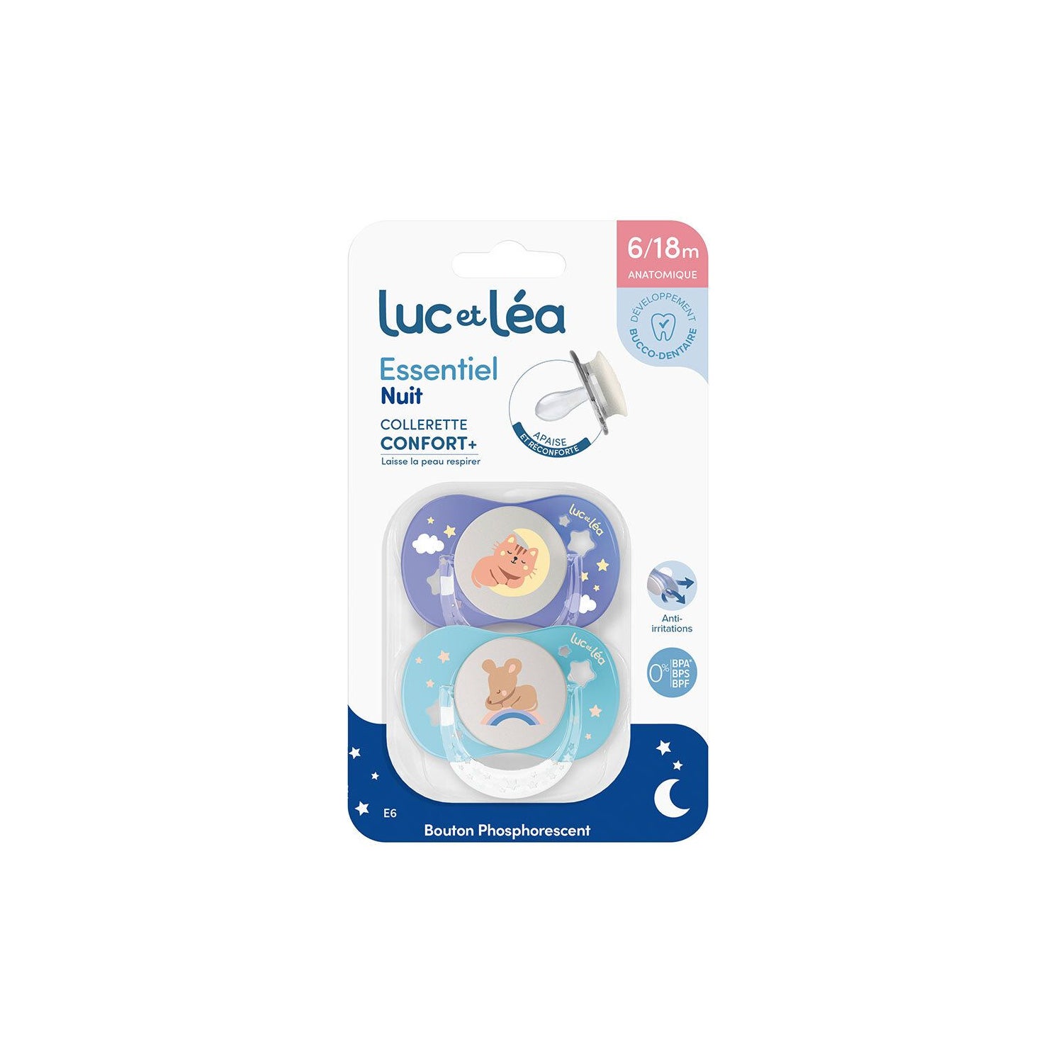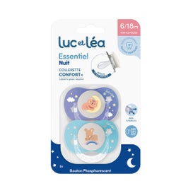 Luc Et Léa Essentiel Night Confort+ Chupete 6-18M E6 2 uds é um chupete projetado para bebês de 6 a 18 meses, que se destaca por sua capacidade de brilhar no escuro. Este chupete conta com um botão fosforescente que proporciona uma suave luminosidade, ajudando a tranquilizar o bebê durante a noite. Além disso, esse design facilita para os pais localizarem o chupete no quarto sem precisar acender a luz, evitando assim interrupções no sono do pequeno.