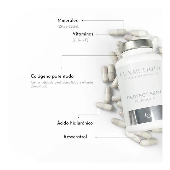 Luxmetique Perfect Skin Formula 90caps é um suplemento alimentar à base de colagénio hidrolisado, extracto de uva, ácido hialurónico, vitaminas e minerais.