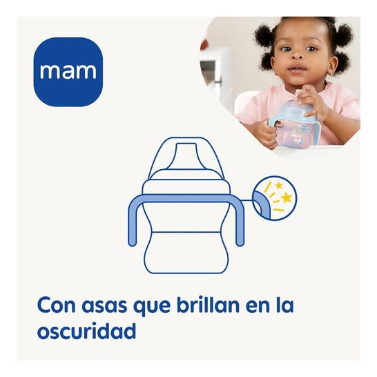 Copo para crianças concebido para ajudar os mais pequenos a fazer a transição do biberão para o copo mais facilmente. Com pegas antideslizantes e um bico à prova de derrames, particularmente macio.