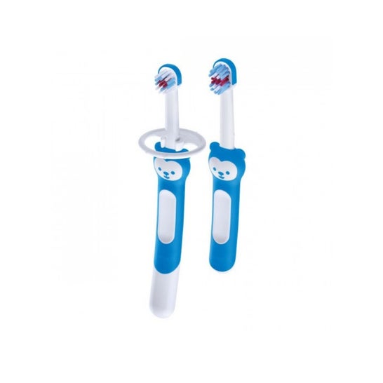 O conjunto de dois escovas de dentes para bebês Mam Babys é projetado especialmente para crianças a partir de 6 meses. A cabeça tem cerdas muito suaves e pequenas, ideais para a delicada boca dos pequenos.