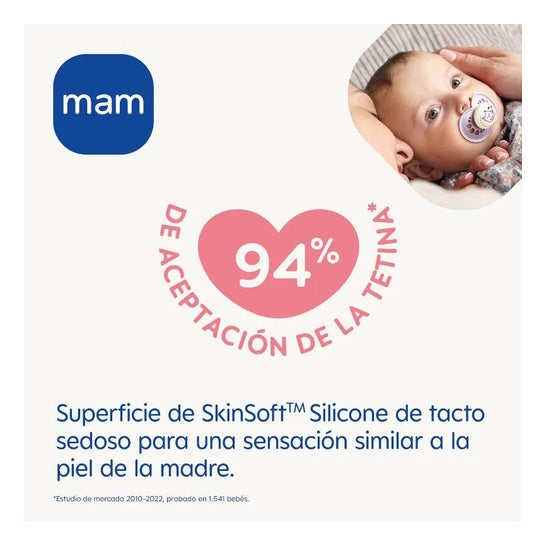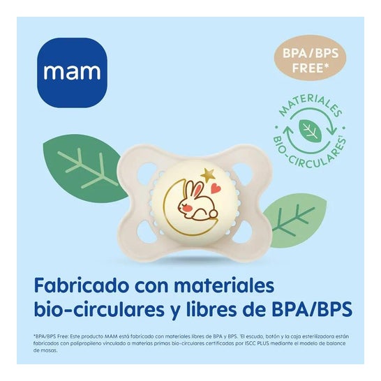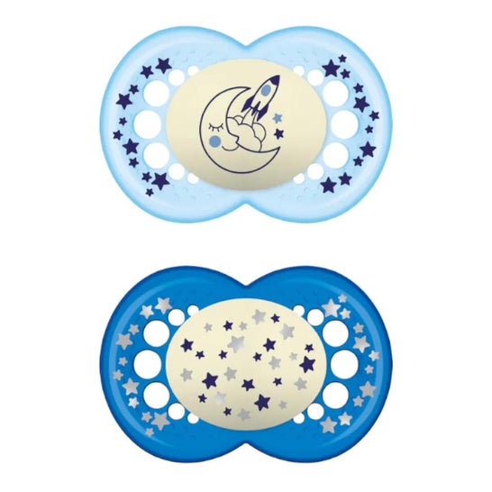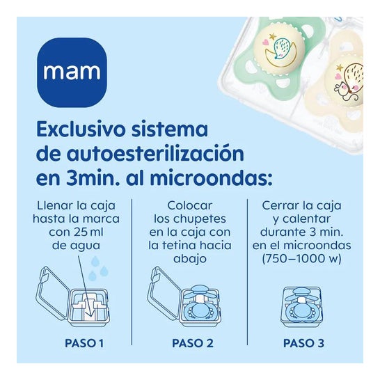 Conjunto de 2 chupetas anatómicas com tetina de silicone e tampa frontal ventilada. Ajuda a satisfazer o instinto natural de sucção do bebé sem interferir com o desenvolvimento da cavidade oral. Inclui uma caixa de esterilização e os produtos são totalmente isentos de BPA e BPS. Adequado para bebés a partir dos 6 meses.