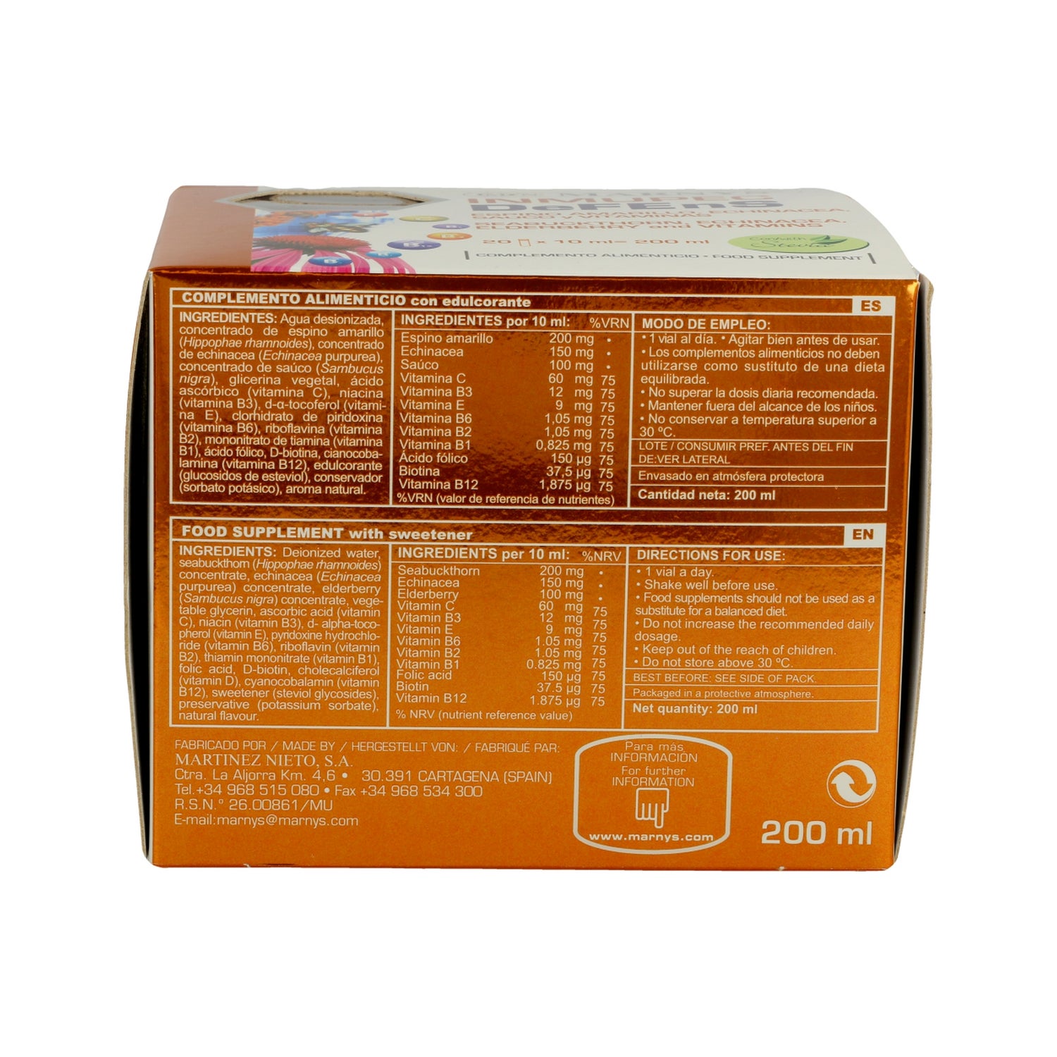 Suplemento alimentar em frascos bebíveis que ajuda a fornecer vitaminas para apoiar o funcionamento do sistema imunitário e o metabolismo energético. É elaborado com vitaminas do complexo B e C, com extractos de plantas como o Espinheiro-marítimo, a Equinácea e o Sabugueiro, tradicionalmente conhecidas pela sua utilidade no frio. É também adequado para processos de inverno, mudanças de rotina, viagens ou mudanças de temperatura, é adequado para veganos e é adoçado com Stevia.