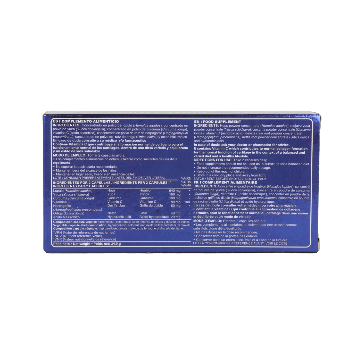 A sua fórmula contém Vitamina C, Cúrcuma, Harpagofito e Urtiga, Lúpulo, Yucca e Ácido Hialurónico, que proporcionam efeito antioxidante, promovem a formação de colagénio, ajudam a reduzir a inflamação muscular, aliviam o desconforto articular e proporcionam flexibilidade às articulações. É também adequado para veganos e pessoas com intolerância ao glúten.