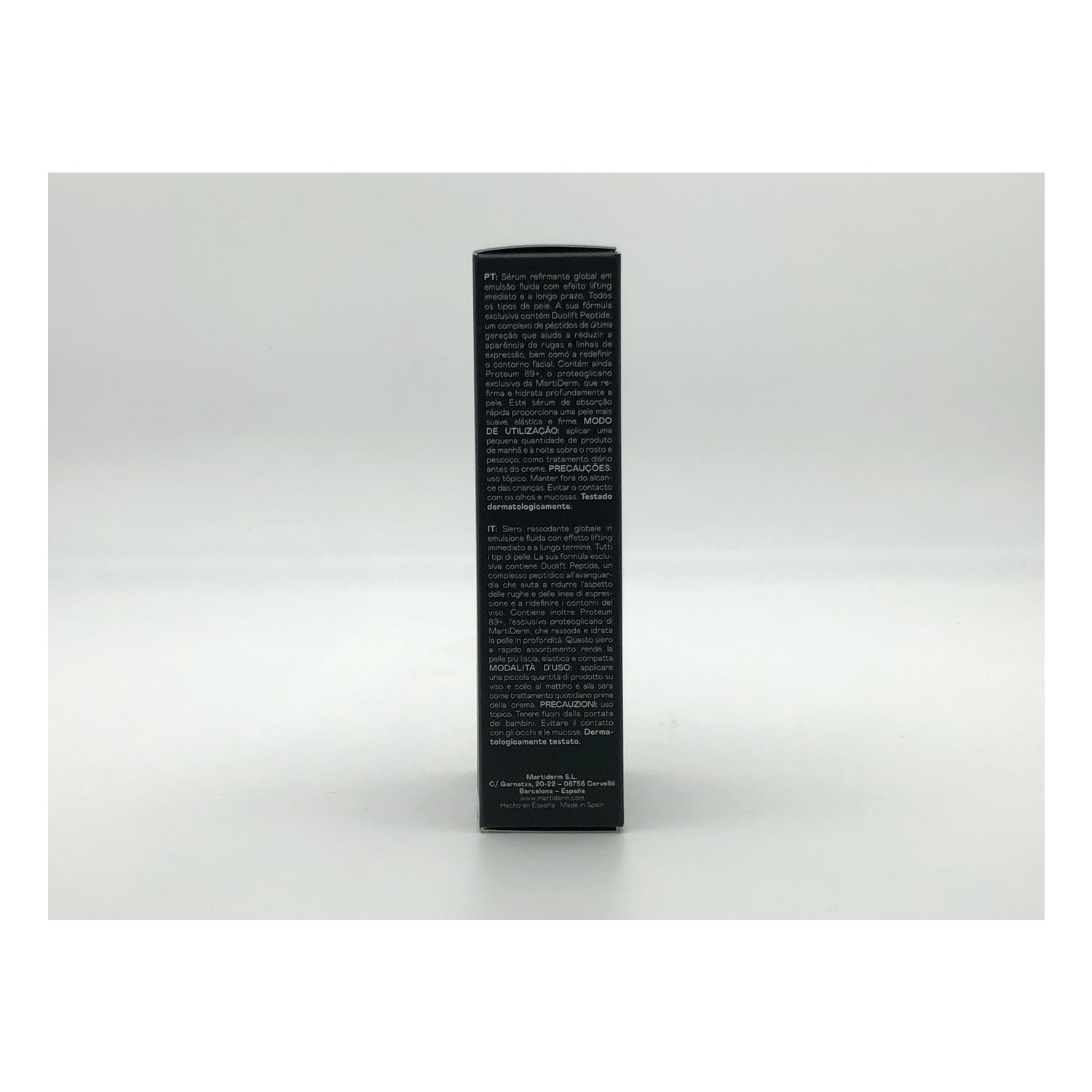 Sérum refirmante global em emulsão fluida com efeito lifting imediato e de longa duração. A sua fórmula exclusiva contém Duolift Peptide, um complexo de péptidos de última geração que ajuda a reduzir o aparecimento de rugas e linhas de expressão e a redefinir os contornos faciais. E também com Proteum 89+, o proteoglicano exclusivo da MartiDerm, que refirma e hidrata profundamente a pele. Este sérum de absorção rápida proporciona uma pele mais lisa, mais elástica e mais firme.