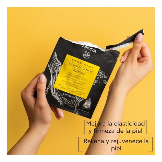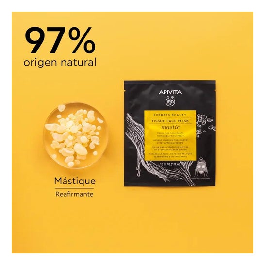 Máscara de tecido facial Apivita que proporciona um efeito calmante e firmador no seu rosto, graças ao seu conteúdo de 97% de origem natural, que firma e ilumina o rosto, promovendo assim a sua elasticidade.