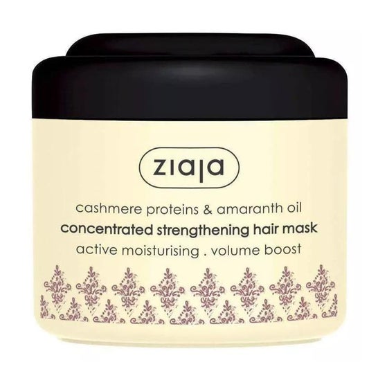 Ziaja Cashmere Strengthening Hair Mask, máscara capilar fortalecedora do cabelo, com proteínas de caxemira e óleo de amaranto. Ajuda a fortalecer e a curar o cabelo, revitaliza-o e melhora a sua elasticidade. Além disso, evita a fragilidade do cabelo e proporciona um brilho natural e um pentear fácil. Indicado para cabelos normais, finos, secos e delicados.