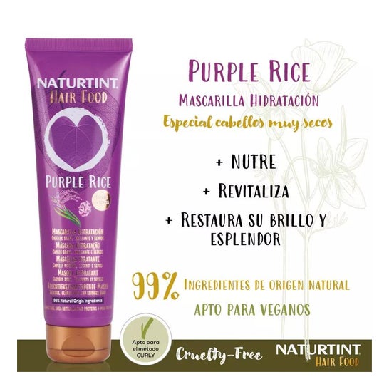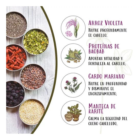 Máscara capilar feita de arroz violeta ou khao gram, uma superalimentação rica em vitaminas, aminoácidos, açúcares e antioxidantes que contribui para nutrir profundamente o cabelo, revitalizando-o e restaurando todo o seu brilho e esplendor.