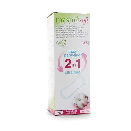 Masmi 2 em 1 Protegeslips Maxi Plus-Ultrafine Pad Pure Cotton pode ser utilizado como Protegeslips Maxi Plus ou como Ultrafine Pad. Foi especialmente concebido para mulheres com incontinência ligeira, perdas de urina e processos do pavimento pélvico. Também é recomendado para os últimos dias da menstruação. 100% algodão, ideal para peles sensíveis.