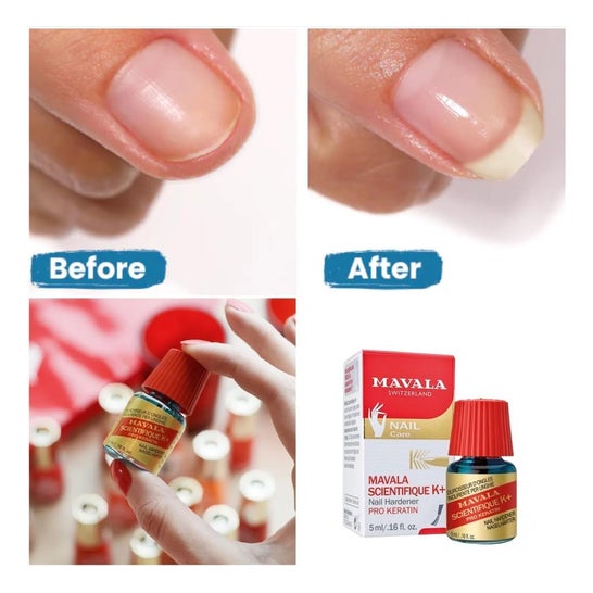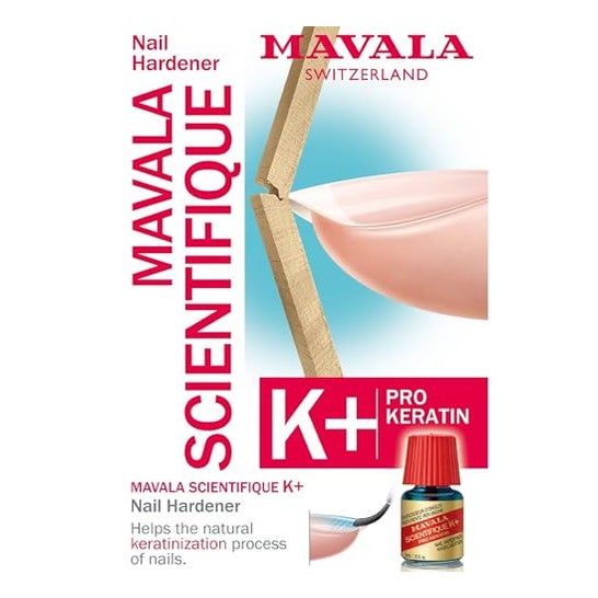 Mavala Science K+ Nail Hardener 5ml é uma solução aquosa que endurece as unhas macias e evita que estas se partam ou se separem. Este produto, útil no caso de unhas partidas ou quebradiças, melhora a coesão das fibras de queratina, permitindo que as três camadas principais do prego se juntem.