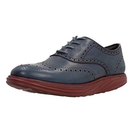 Sapato azul marinho com sola castanha para homem, biqueira redonda, com atacadores azul marinho, com acabamento vazado para maior transpiração. Sola de borracha, proporciona conforto e comodidade, cuidando do impacto diário e evitando dores nos pés cansados. Interior tecido com dupla camada, reforçando a qualidade e ajustando-se melhor ao pé. Tamanho 45.