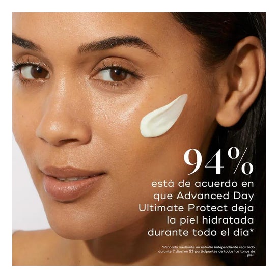Como último passo da sua rotina matinal de cuidados com a pele, aplique 5 pressões (¼ de colher de chá) de Advanced Day Ultimate Protect com movimentos ascendentes sobre o rosto, tendo cuidado para evitar a área dos olhos.