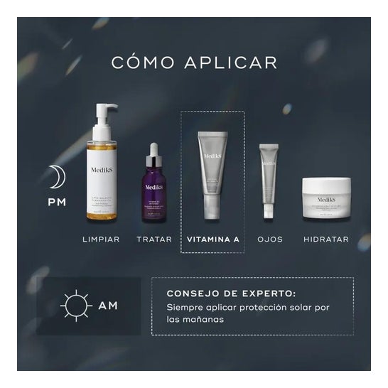 Utilizar duas vezes por semana durante as duas primeiras semanas, uma noite sim e outra não durante as duas seguintes, e depois todas as noites. Consulte um médico se estiver amamentando ou grávida. Sempre deve utilizar um protetor solar pela manhã enquanto utiliza a vitamina A.