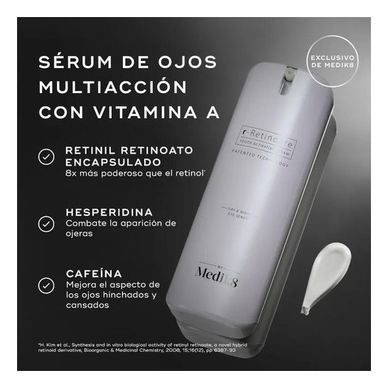 Medik8 R-Retinoate Sérum Olhos Dia e Noite 15ml é um tratamento avançado projetado para a área dos olhos, que transforma visivelmente a aparência do olhar. Este sérum, graças à sua fórmula exclusiva com retinil retinoato encapsulado, é oito vezes mais potente que o retinol convencional, combatendo eficazmente sinais de envelhecimento como: