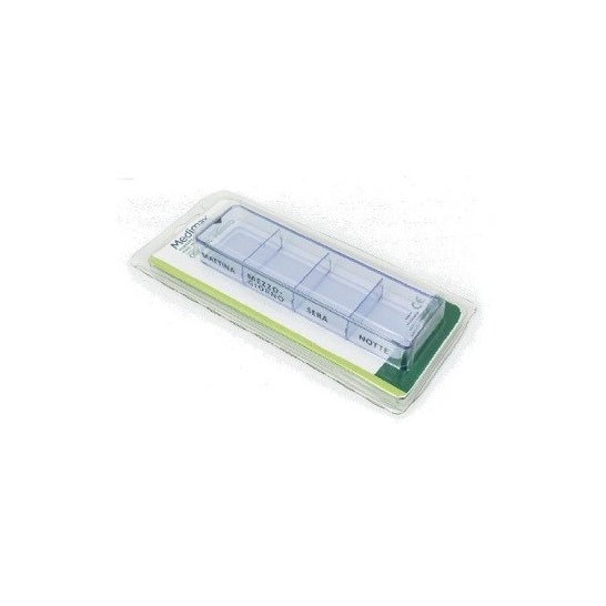 Caixa de comprimidos diária feita de metacrilato, o que favorece o armazenamento de medicamentos. Tem 4 compartimentos com tampa de abertura, um para cada dose, nos quais se podem guardar os medicamentos, facilitando a sua divisão durante o dia. Ajuda a lembrar e a preservar o tratamento médico. O seu tamanho compacto torna-o ideal para o transporte.