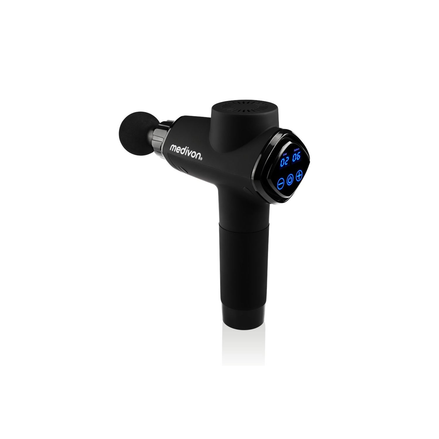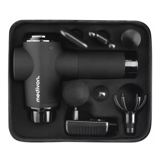 Medivon Pack Gun Pro X é um massageador corporal que inclui seis cabeçotes intercambiáveis para se adaptar a diferentes necessidades de massagem. Este dispositivo é projetado com um painel táctil, o que facilita seu acionamento e desligamento, assim como o ajuste da velocidade de trabalho.