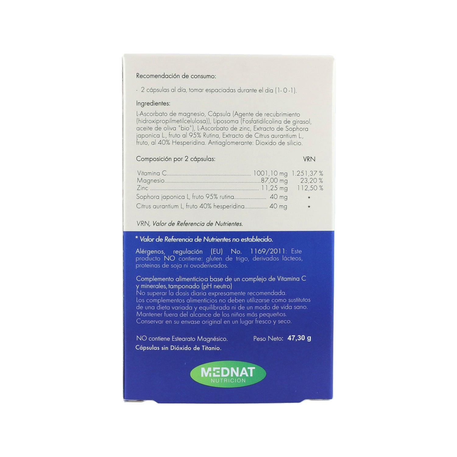Suplemento alimentar à base de vitamina C com pH neutro, nanopartículas lipídicas, magnésio e zinco. Ajuda o sistema imunitário a funcionar correctamente e melhora a absorção do ferro. Promove a produção natural de colagénio, reforçando a estrutura dos vasos sanguíneos, ossos, cartilagens, gengivas, pele e dentes. Ajuda a manter a função psicológica normal, promovendo ao mesmo tempo a protecção das células contra danos oxidativos. Sem glúten. Adequado para veganos.