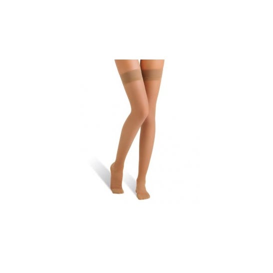 Estas meias de compressão da marca Radiante são do tamanho 4M. São fabricadas com o objetivo de oferecer conforto às pernas. Compressão de nível 2. São meias anatómicas, o que favorece o conforto ao caminhar. Recomenda-se o seu uso para todos os tipos de pele, mesmo para as mais sensíveis. São fáceis de colocar e tirar e oferecem relaxamento aos dedos e antepé. São fáceis de cuidar e lavar, à mão ou à máquina. Ajustam-se sem mostrar dobras que possam incomodar em contato com o calçado. O seu calcanhar reforçado proporciona uma maior durabilidade. Ajudam as mulheres que sofrem de dor, peso e fadiga causada por varizes. Ideais para serem usadas no pós-escleroterapia ou pós-cirurgia. Também é recomendado o seu uso em grávidas com histórico de flebite. Não devem ser usadas para dormir.