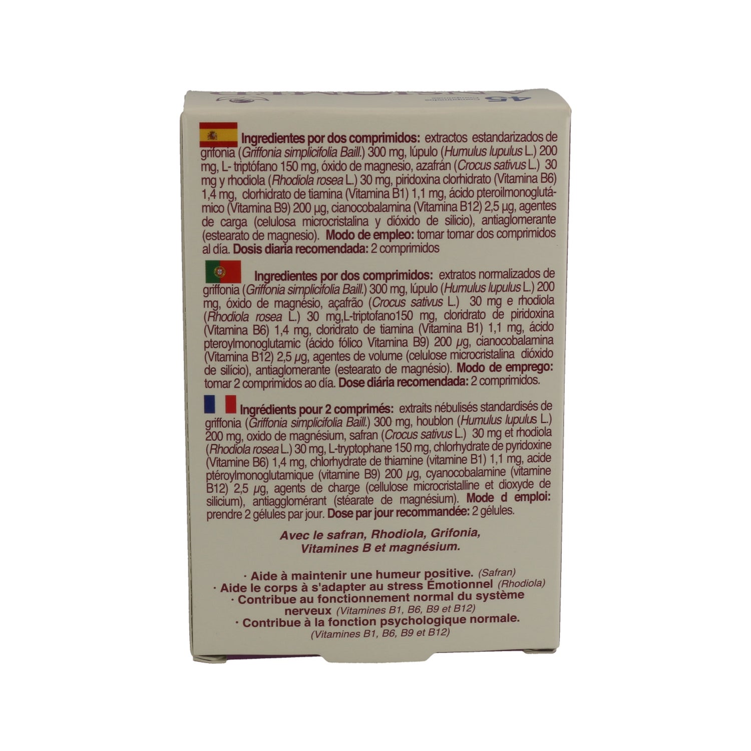 Formulado com açafrão, rodíola, griffonia, magnésio e vitaminas de gel do grupo B cujos ingredientes activos contribuem para reduzir o stress e para o funcionamento normal do sistema nervoso