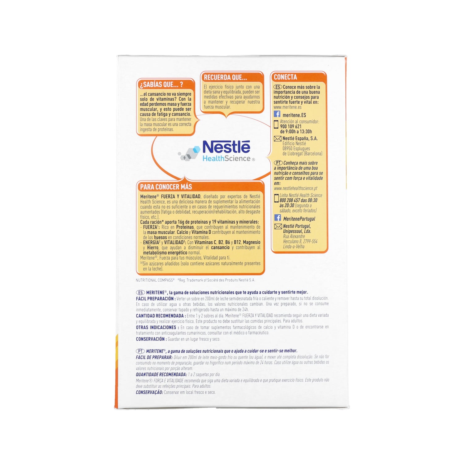 Nestlé Meritene Strength and Vitality Strawberry Flavour 15 saquetas é um suplemento alimentar sob a forma de pós para fazer batidos com um agradável sabor a morango.