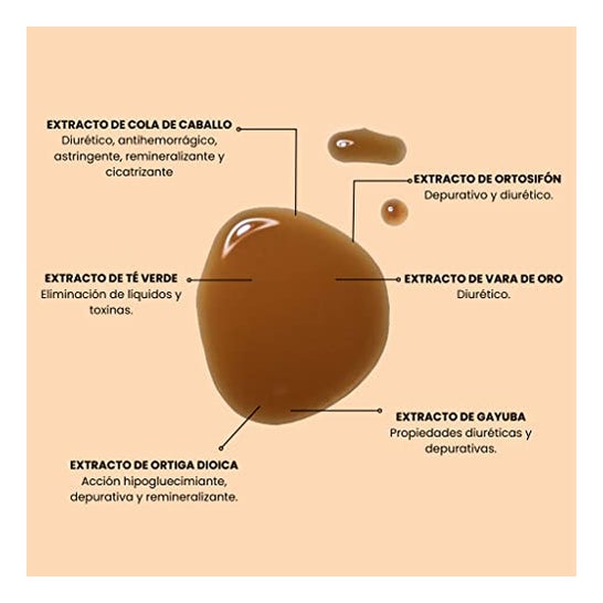 Formulado com cavalinha, urtiga dioica, bearberry, goldenrod, orthosiphon, ananás, uvas que proporcionam uma protecção antioxidante natural de origem vegetal. Enriquecido com café verde, chá verde, centella asiatica e ruscus com propriedades anti-inflamatórias, venotónicas, tonificantes e diuréticas.