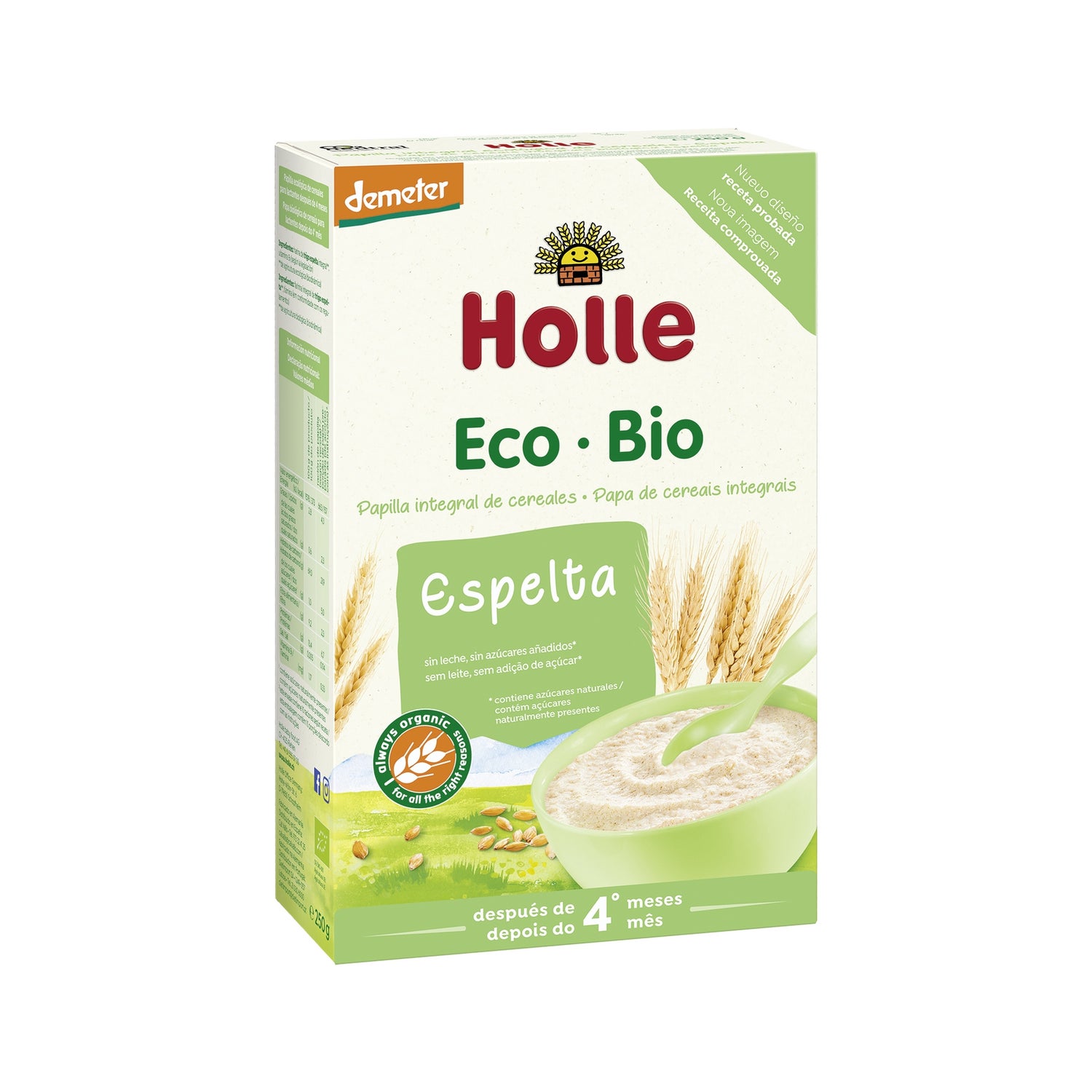 Alimentos instantâneos para bebés feitos de farinha integral 100% de farinha de espelta orgânica. Ajuda a nutrir e alimentar os mais pequenos, com uma composição fácil de digerir. Sem adição de açúcares ou lactose, é muito fácil de preparar e tem um agradável sabor natural. É uma fonte de fibras alimentares, proteínas vegetais e hidratos de carbono complexos, que promovem o desenvolvimento adequado dos bebés a partir dos 4 meses de idade.