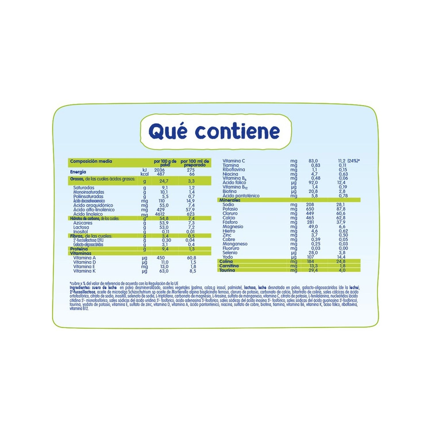 Contém HMO 2'FL que fortalece o sistema imunológico, um componente do leite materno que fortalece o sistema imunológico e protege contra infecções. A ARA contribui para o desenvolvimento cognitivo. Apoia o desenvolvimento do sistema nervoso. GOS, uma fibra prebiótica que apoia o desenvolvimento saudável da flora intestinal, estimula o crescimento de bifido-bactérias e alivia a constipação.