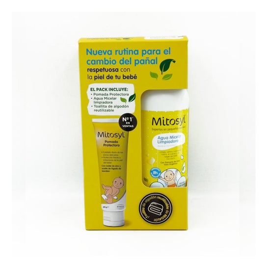 Mitosyl Pack Pomada Protetora 65 g + Água Micelar 500 ml para o cuidado da pele do bebê reúne uma pomada protetora e uma água micelar para uma higiene suave e uma proteção eficaz na área da fralda. Está pensado para peles sensíveis de recém-nascidos. Oferece limpeza delicada sem enxágue e ajuda a prevenir vermelhidões, irritações e assaduras desde o primeiro dia.