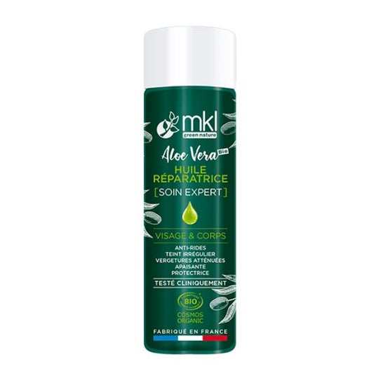 Óleo reparador para rosto e corpo, com aloe vera como principal ativo. O aloe vera é rico em aminoácidos, minerais e vitaminas, o que ajuda a ter uma pele hidratada, calma e regenerada. Outros componentes incluem: Ácido hialurónico, que ajuda a evitar a perda de água da pele. Diam Oléoactif®, composto patenteado com propriedades antioxidantes que ajuda a densificar a rede de colágeno da pele. Extrato de chá verde orgânico, conhecido como adstringente que favorece a destruição de radicais livres. Óleo de argan orgânico e óleo de soja, que ajudam a nutrir, regenerar, suavizar a pele e combater o envelhecimento cutâneo. Todos os ingredientes deste óleo regenerador são 100% orgânicos e não testados em animais.