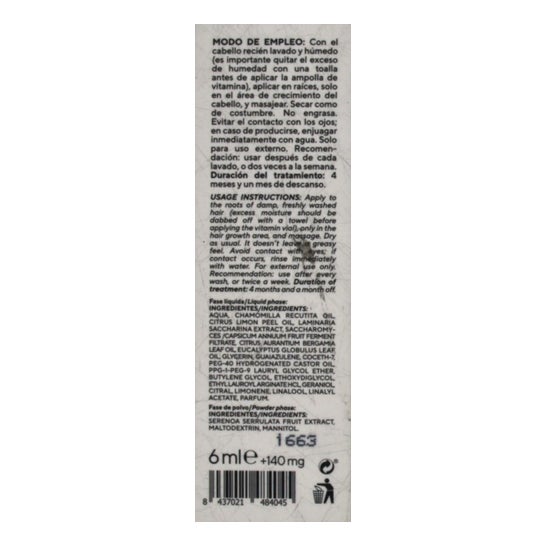 Tratamento capilar em ampolas formulado com vitaminas e extrato de palmeira anã. Ajuda a reforçar o bolbo capilar e a equilibrar o couro cabeludo. Os seus ingredientes têm propriedades seborreguladoras e volumizadoras. Indicado para cabelos enfraquecidos ou frágeis.