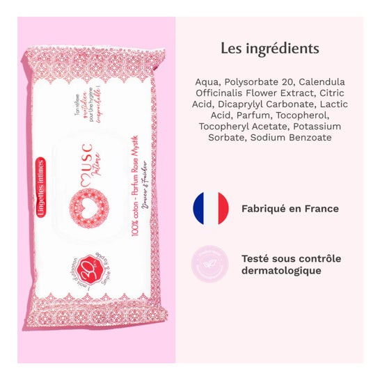 Musc Intime Toalhetes Íntimos Rose Mystik 30uds estão destinados à higiene íntima e impregnados com a fragrância de almíscar branco e rosa mística.