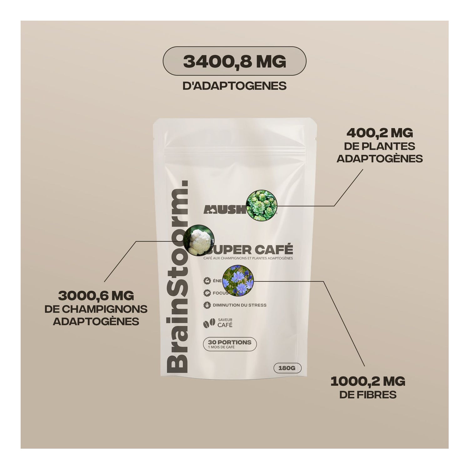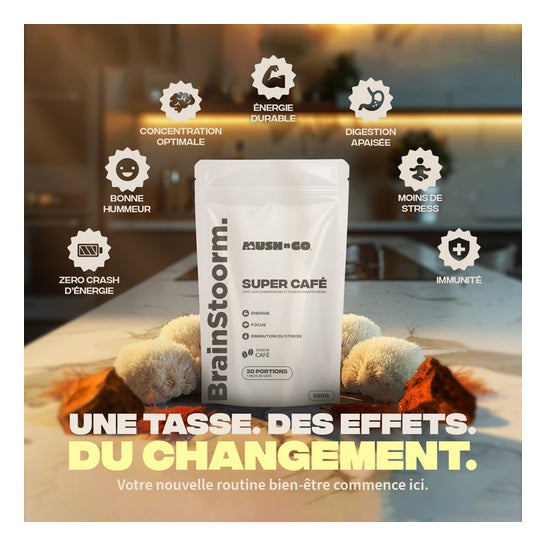 Mush N Go Café Adaptógeno Brainstoorm Sabor Café 180 g é um substituto de café elaborado a partir de plantas e fungos adaptógenos. Este produto foi projetado para: