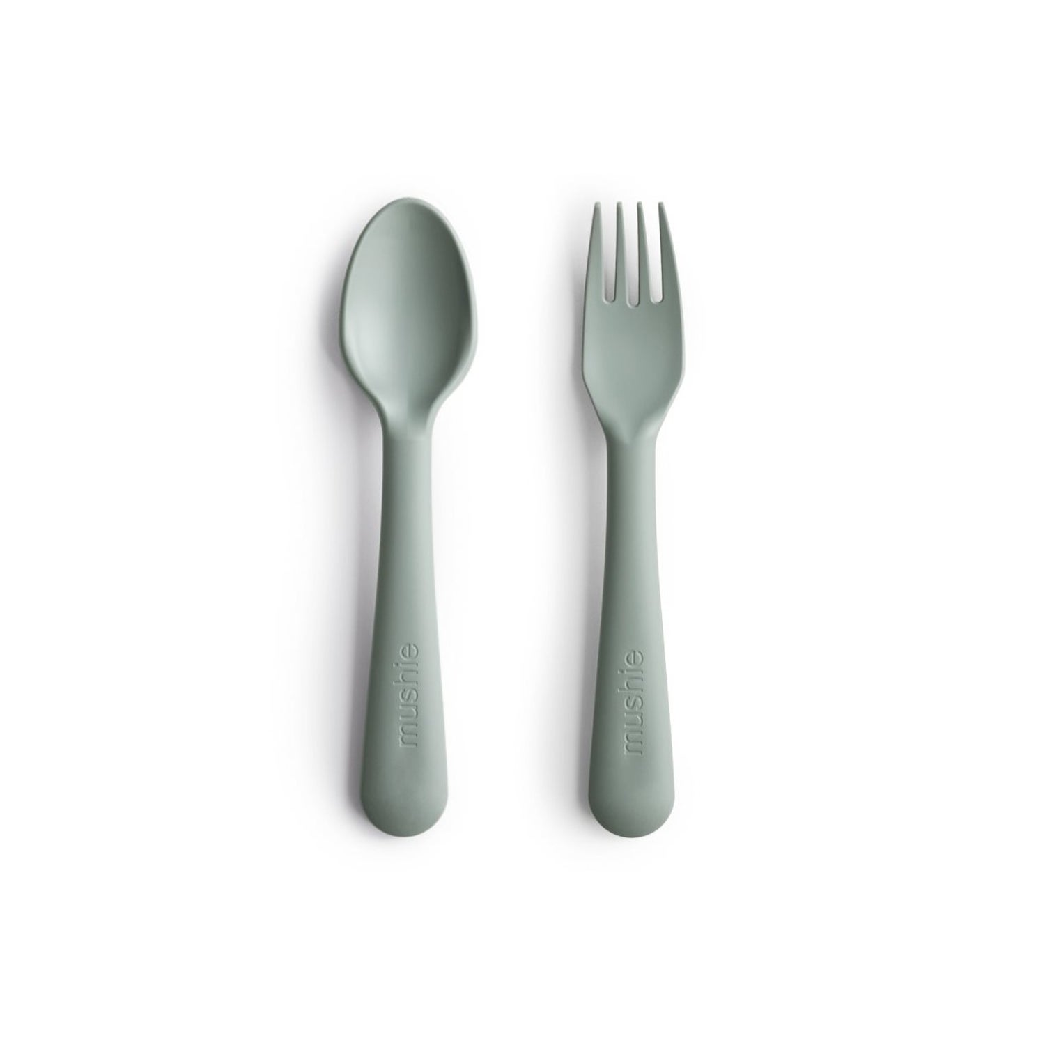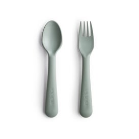 Conjunto de talheres de plástico verde. Estes utensílios são feitos de material seguro para a alimentação. O seu design torna-os ideais para os membros mais jovens da família, uma vez que tanto o seu tamanho como a sua forma os tornam fáceis de agarrar. Lavagem da louça em segurança. Este kit contém: