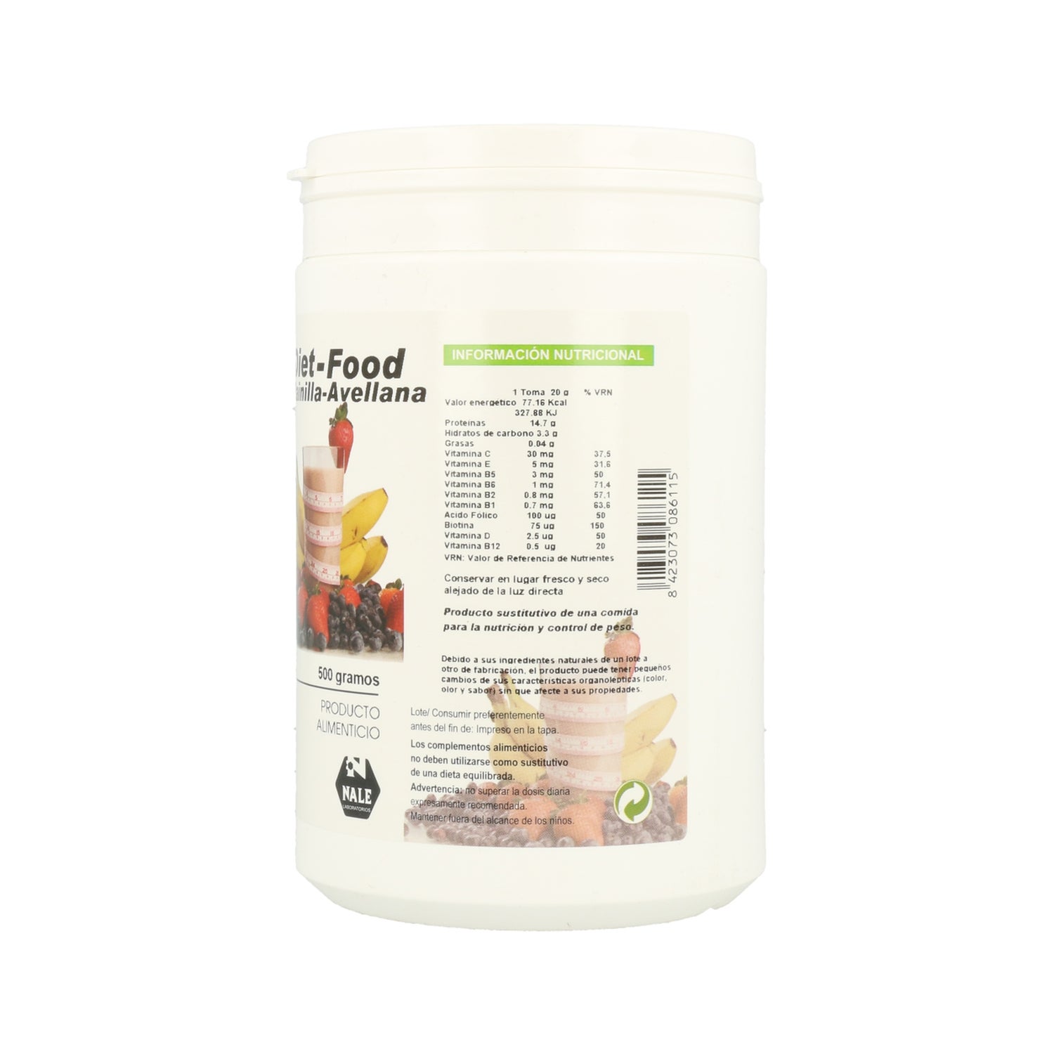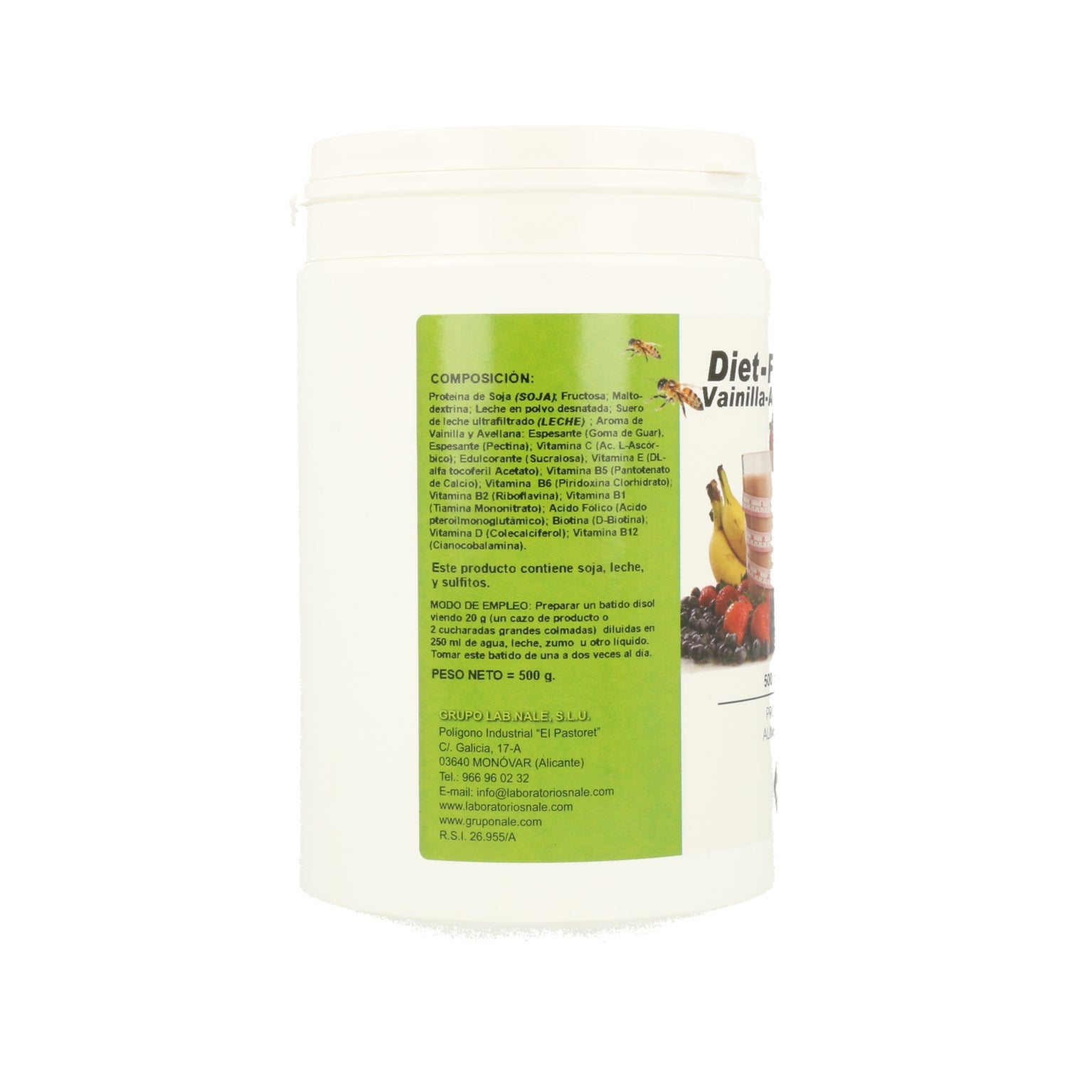 Produto alimentar em pó para a preparação de batidos aromatizados, enriquecido com proteínas e destinado a substituir as principais refeições do dia.A composição fornece: Biotina, Aroma de baunilha e avelã, Soro de leite ultrafiltrado, Aromatizante de acordo com o sabor, Vitamina B7-Biotina, Leite em pó desnatado, Espessante, Vitamina B5, Vitamina D, Ácido fólico, Goma guar, Maltodextrina, Vitamina E, Vitamina B12, Vitamina B6, Vitamina B2, Vitamina B1, Vitamina C, Pectina, Proteína de soja, Edulcorante, Frutose.