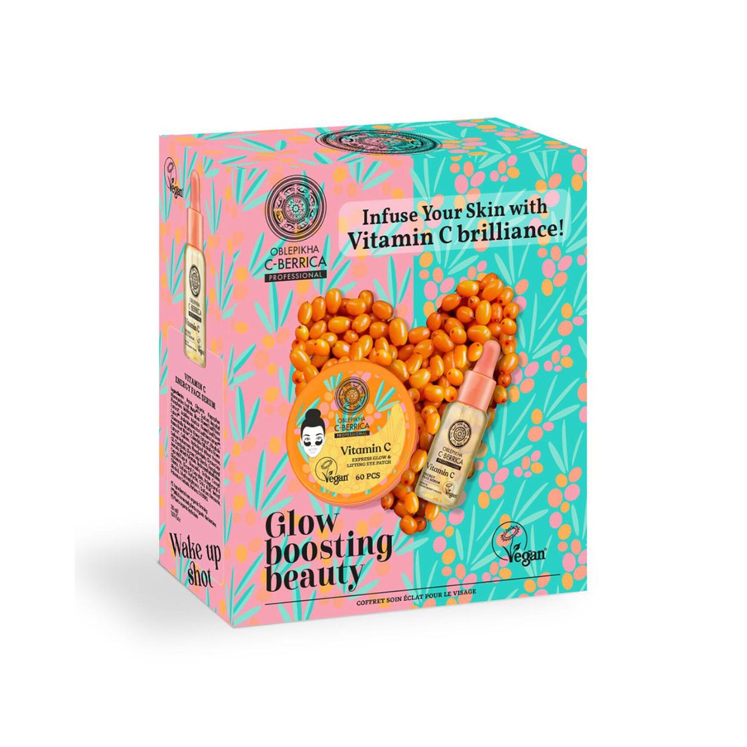 Natura Siberica Oblepikha C-Berrica Glow Boosting Beauty Set é um conjunto projetado para realçar a luminosidade da pele. Este set inclui um serum facial energizante e patches reafirmantes para a área dos olhos, que trabalham em sinergia para revitalizar e proporcionar uma aparência radiante.