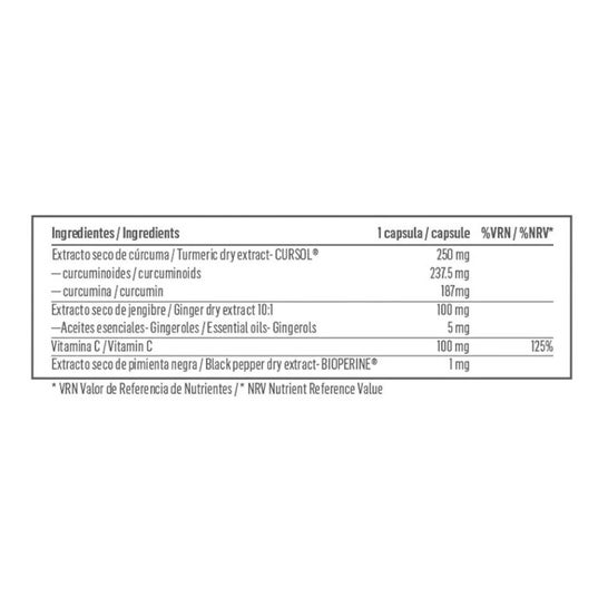 Suplemento alimentar em cápsulas à base de extrato de curcuma, vitamina C e gengibre. Contribui para o cuidado das articulações e ajuda a proteger as células da ação dos radicais livres. Os seus componentes têm propriedades anti-inflamatórias e antioxidantes. Indicado para adultos.