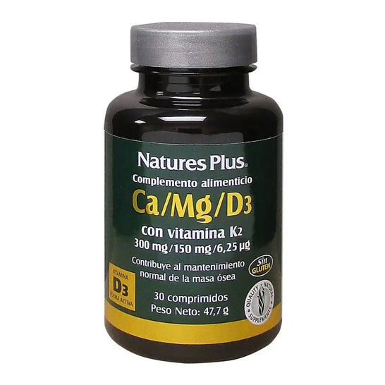NaturesPlus Ca/Mg/D3 e Vitamina K2 30 comprimidos é um suplemento alimentar contendo Ca/Mg/D3 com vitamina K2. Contribui para a manutenção da massa óssea normal, não contém glúten e é feito a partir de minerais e magnésio com vitaminas D3 e K2.