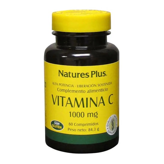 NaturesPlus Vitamina C 1000mg 60comp é um suplemento alimentar que contém vitamina C e rose hips.